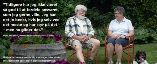 ”Jeg er et foreningsmenneske,” slår hun fast om sit kæmpestore engagement, der går tydeligt igennem bilstøj, bluetooth og tværs over landet. Hun har lige rundet de 70 og er den nye generation i Røde Kors i Ribe, hvor formand Poul Madsen er begyndt at synes, at der gerne må komme nye kræfter til. Derfor er han rigtig glad for Margrethe, der er kommet ind i bestyrelsen med ny energi.