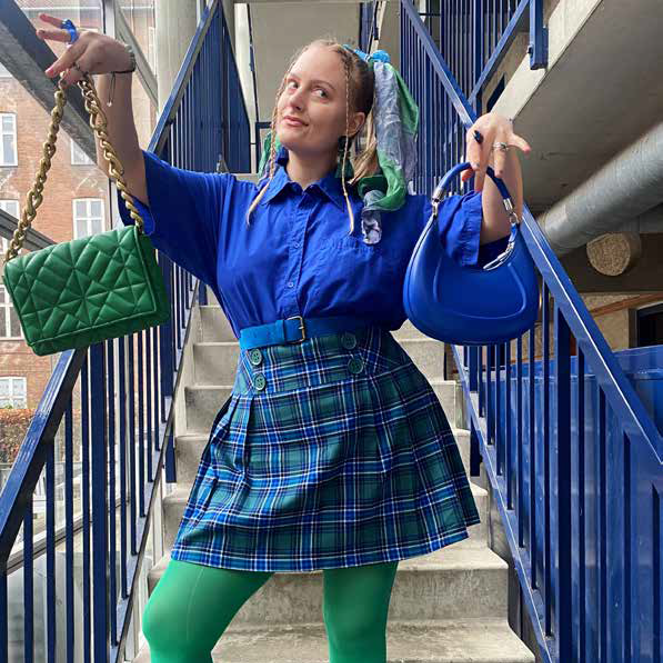 "Da jeg flyttede til København for at læse, gik jeg kun i sort og kun i mærkevaretøj. I dag er jeg helt ligeglad med mærker, og farverne betyder alt," siger Maja, der er en af Røde Kors Genbrugs frivillige fashion scouts. Hun har til opgave at finde og style lækkert genbrug og dele inspiration og tips på Instagram. Det er en god måde at være frivillig på, synes hun, fordi hun helt selv styrer, hvor og hvornår hun arbejder.