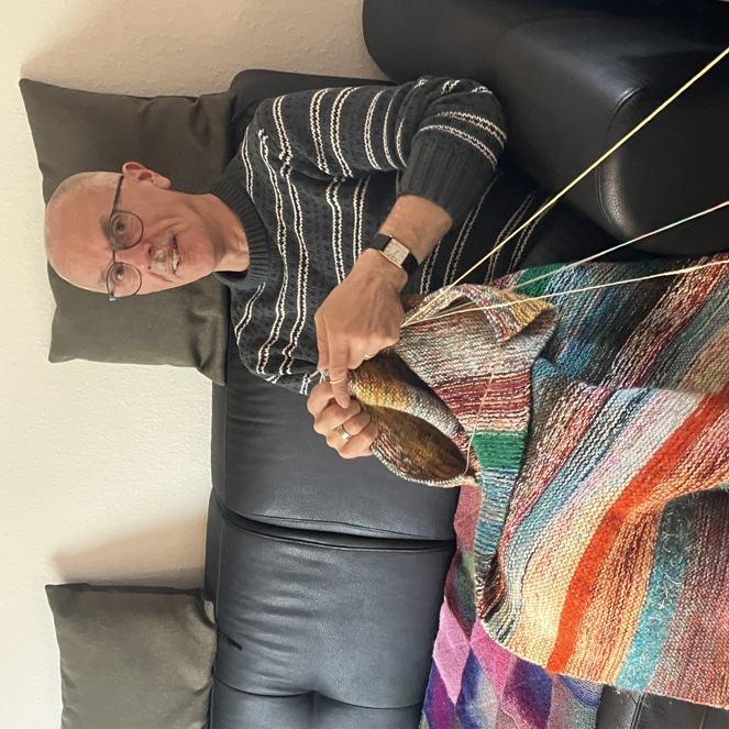Sammen med sin mor fortsatte han med at strikke små firkanter, som hun syede sammen til tæpper. Og tæpperne afleverede de i den lokale genbrugscontainer i Ulstrup. Og sådan blev strik bare en naturlig del af dagligdagen. ”Op igennem tiden har min mor og jeg altid siddet med noget håndarbejde, når vi så fjernsyn. ’Ellers falder vi bare i søvn,’ som hun sagde. Og nu har jeg også familie i København, og så sidder jeg bare ved siden af og strikker, når vi kører frem og tilbage. Ellers føler man bare, at man spilder tiden. Så kan man da lige så godt strikke lidt imens,” siger Brian.